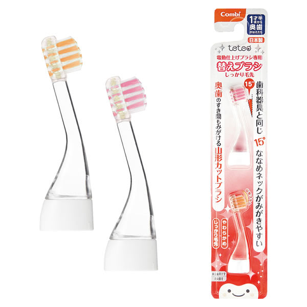 ■備考:テテオ あてて磨くだけ 電動仕上げブラシ専用の替えブラシに、奥歯もしっかり磨ける「しっかり毛先」登場!2本セット(オレンジ・ピンク各1本)。