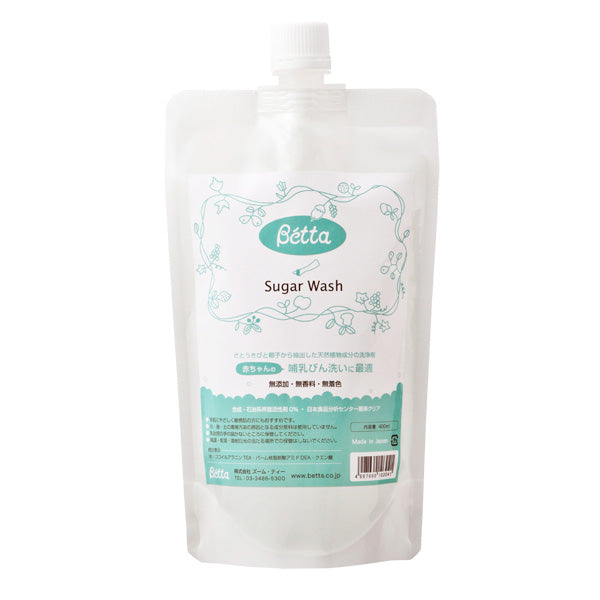 毎日ご使用いただけるアミノ酸系洗浄剤。さとうきびと椰子から抽出した天然の植物油のやさしい洗浄料なので、哺乳びんはもちろん、赤ちゃんの食器洗いにも最適です。ご使用後の哺乳びんの洗浄は、ぬるま湯にひたしてミルクを軽く洗い流してから、専用ブラシにシュガーウォッシュを1~2滴たらしてよく洗い、流水でよくすすいでください。ベッタシュガーウォッシュは、川・海・土の環境汚染の原因となる成分原料は使用しておりません。