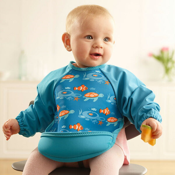 ●ウェットスーツ素材と防水素材でできた、とっても軽くて軟らかい袖付きのベビー用エプロンです。