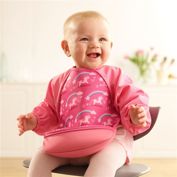 ●ウェットスーツ素材と防水素材でできた、とっても軽くて軟らかい袖付きのベビー用エプロンです。