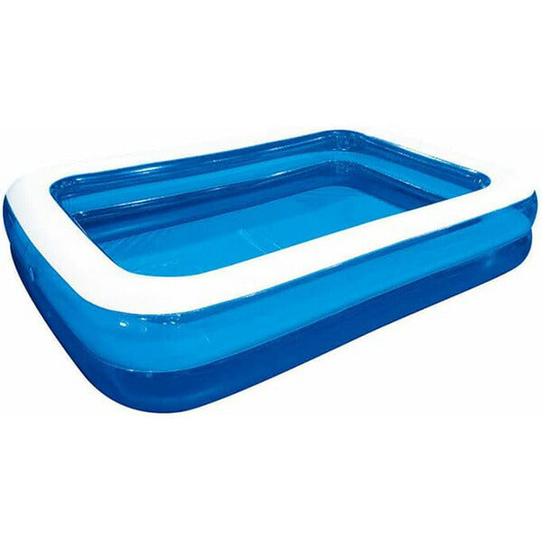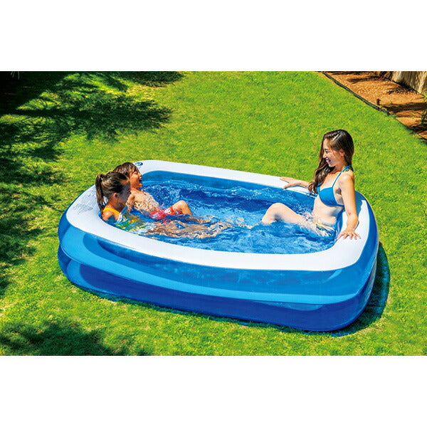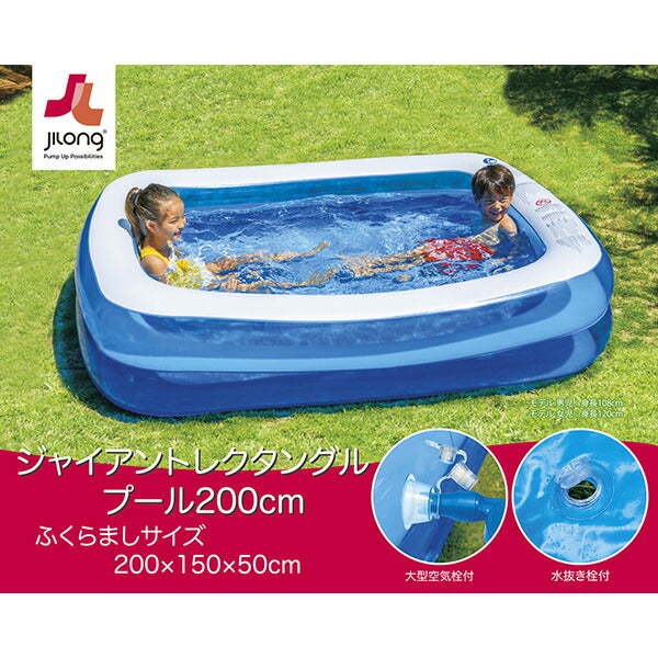 海外のインフレータブルブランド「JILONG」のプールです。膨らんだ状態の長さ約200cm、横幅約150cm、高さ約50cmの長方形の大型プールです。このプールには空気の注入、排出が容易な大型の空気栓が取り付けられています。