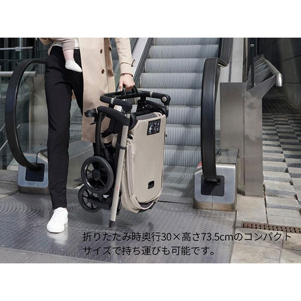 背面・対面どちらのモードでも折りたたみが可能。折りたたみはワンハンドで女性でも驚くほどスムーズに操作ができ、しっかり安定して自立します。たたんだ後はハンドルやファブリックが地面につかず清潔です。折り畳み時の奥行サイズはシート切替タイプTOPクラスの30cm。玄関の一角にもコンパクトに収まります。重量8.7kgで、フォールディンググリップを持って持ち運びも可能です。