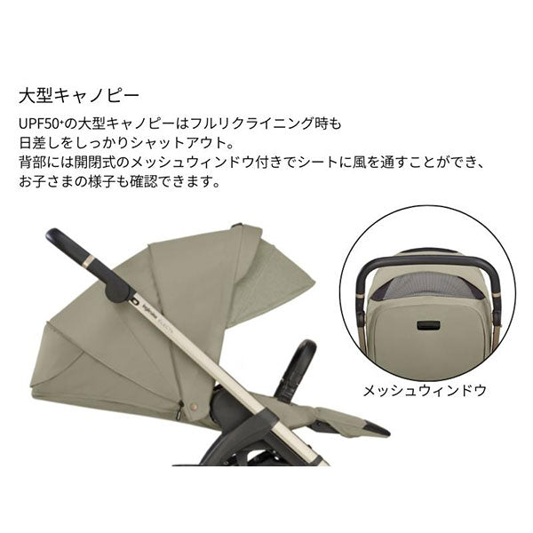 本体幅50cmのコンパクトボディながらゆったりとした居住空間を確保。キャノピーはフルリクライニング時でもお子さまを日差しからしっかり守る大型サイズで、UPF50+で紫外線をカット。背部には開閉式のメッシュウィンドウ付きでシートに風を通すことができ、お子さまの様子も確認できます。リクライニングは成長やその日の気分に合わせて4段階に調整可能、フットレストは2段階に調整可能です。