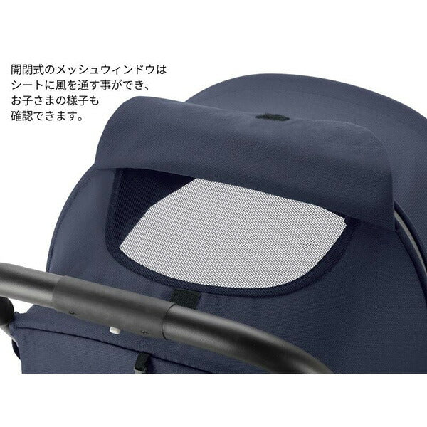 大型キャノピーはUPF50+でしっかり日差しを遮り、ファスナー伸長式で必要に応じて2段階に長さを変えられます。開閉式のメッシュウィンドウ付きでシートに風を通すことができ、頭部側はめくりあげて固定することができるので更にしっかり通気が確保できます。リクライニングは110~170°の間で無段階調整、フットレストは2段階に調整可能です。