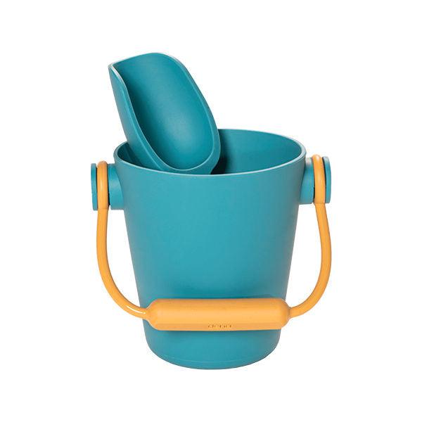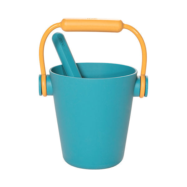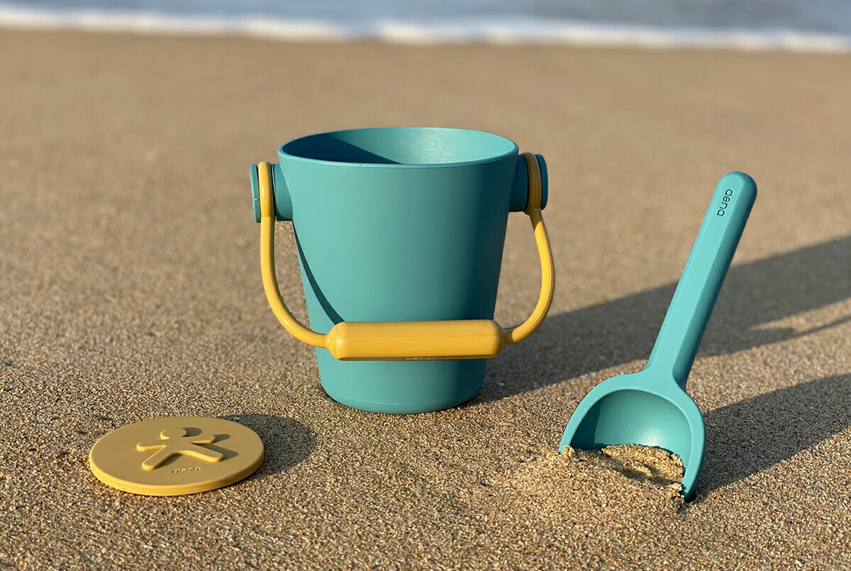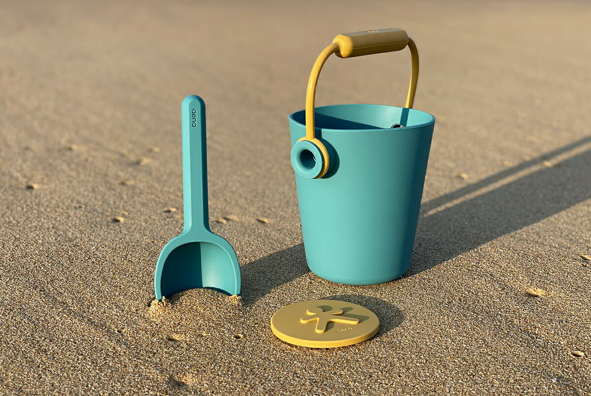 ビーチセットはお砂場やプール、海などで遊べるおもちゃ。バケツとスコップ、押し型1個がセットになっています。バケツはハンドルの根本部分に穴があり、じょうろとしても使用可能です。