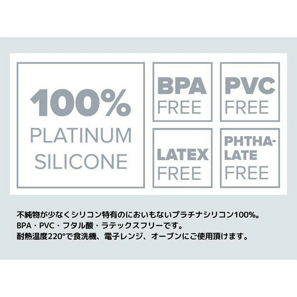食品用・医療用・衛生用品などに多く使われるプラチナシリコン100%で、不純物が少なくシリコン特有のにおいも少なくなっています。BPA・PVC・フタル酸フリーで食洗機使用可能です。