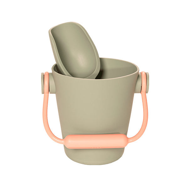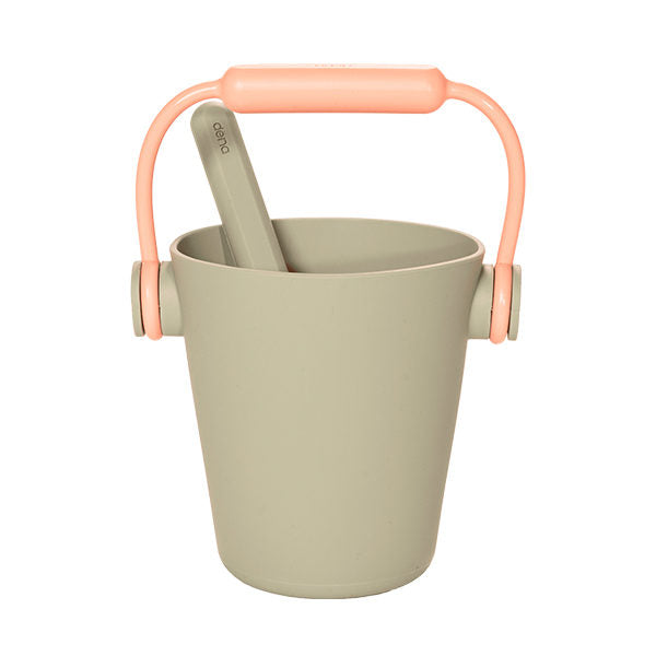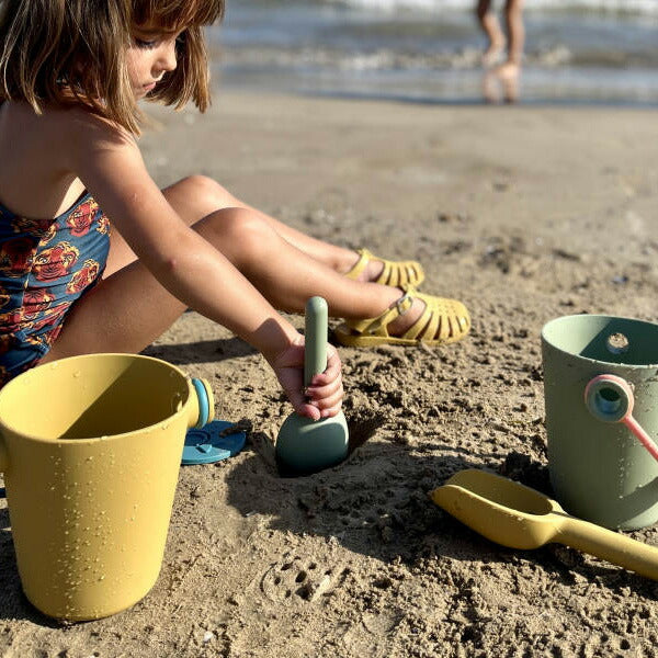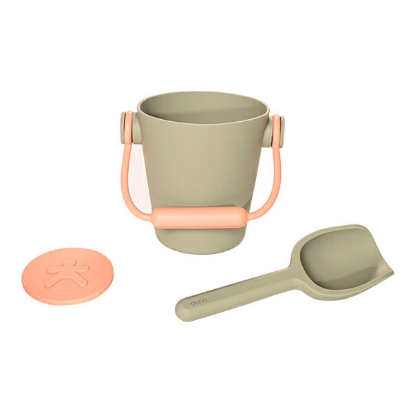 ビーチセットはお砂場やプール、海などで遊べるおもちゃ。バケツとスコップ、押し型1個がセットになっています。バケツはハンドルの根本部分に穴があり、じょうろとしても使用可能です。
