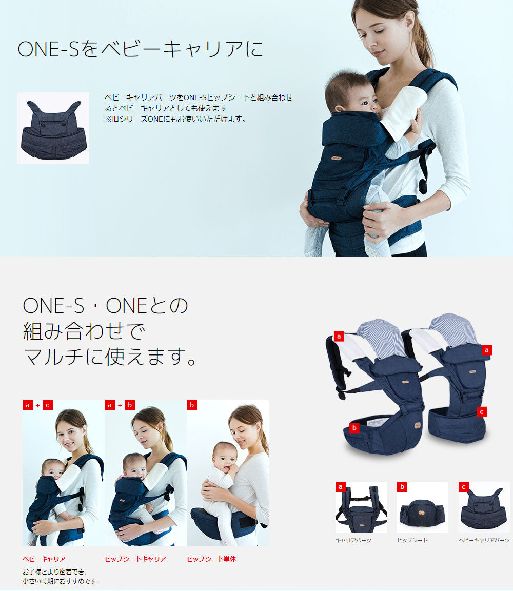 ヒップシート(台座)部分を取り外し、ベビーキャリアパーツに付け替えることで、ベビーキャリア(腰ベルトタイプの抱っこひも)としてご使用いただけます。
