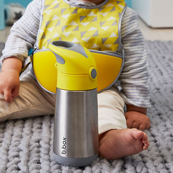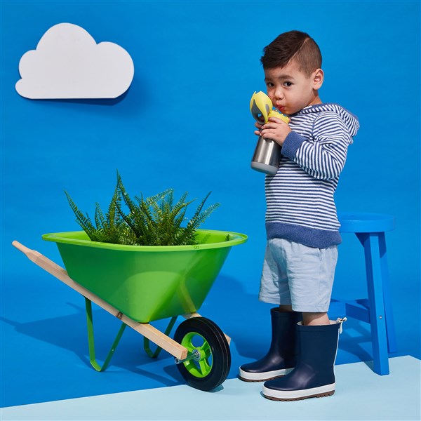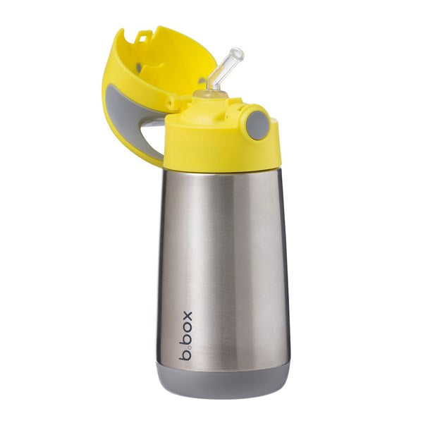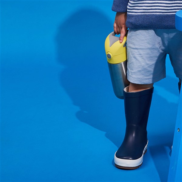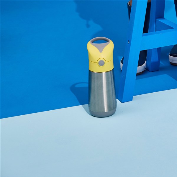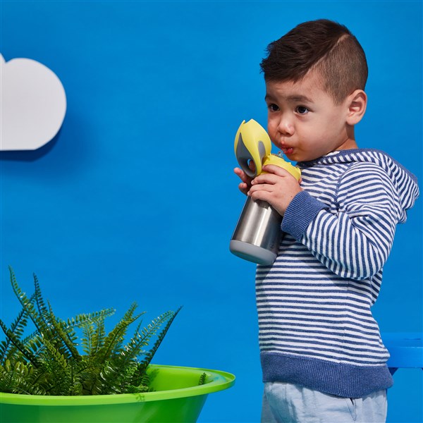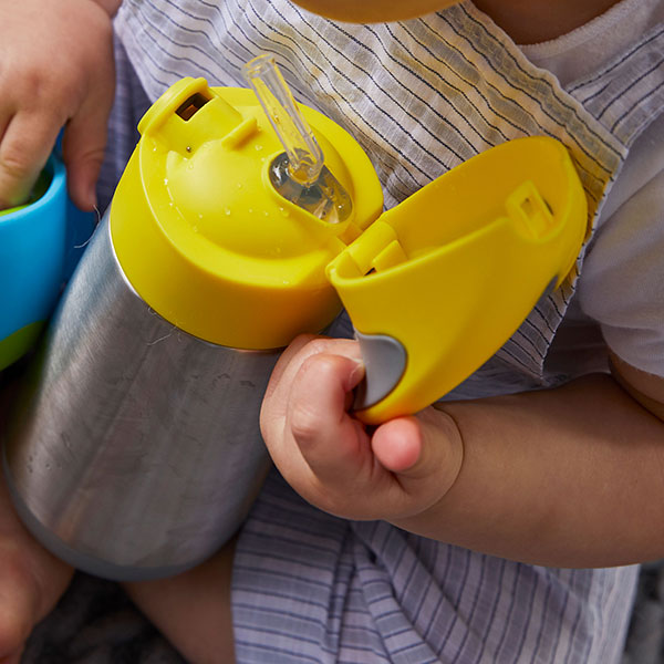 キャリーハンドル付き二重壁の断熱性ステンレスボトル。冷たいものは最長8時間、温かいはものは最長6時間温度を保つことができます。ブッシュボタンの中には便利 なストローの飲み口。小さい手でも持ちやすいボトル設計です。